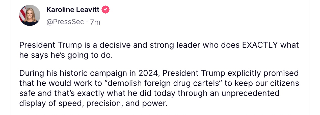 根据特朗普总统的说法,精英美国三角洲部队进行了夜间突袭。