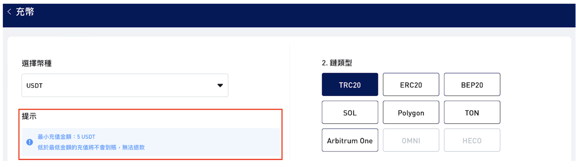 在进行充币时,您将在充币页面上看到最低充币金额的提示。请注意,低于此最低金额的充值将不被接受,根据我们的政策也无法处理退款。一旦充值低于所需的最低金额,将不会入账到您的 Coinstore 账户,也无法提供进一步的帮助或资金恢复。为避免问题,请确保您的充值达到或超过规定的最低金额。