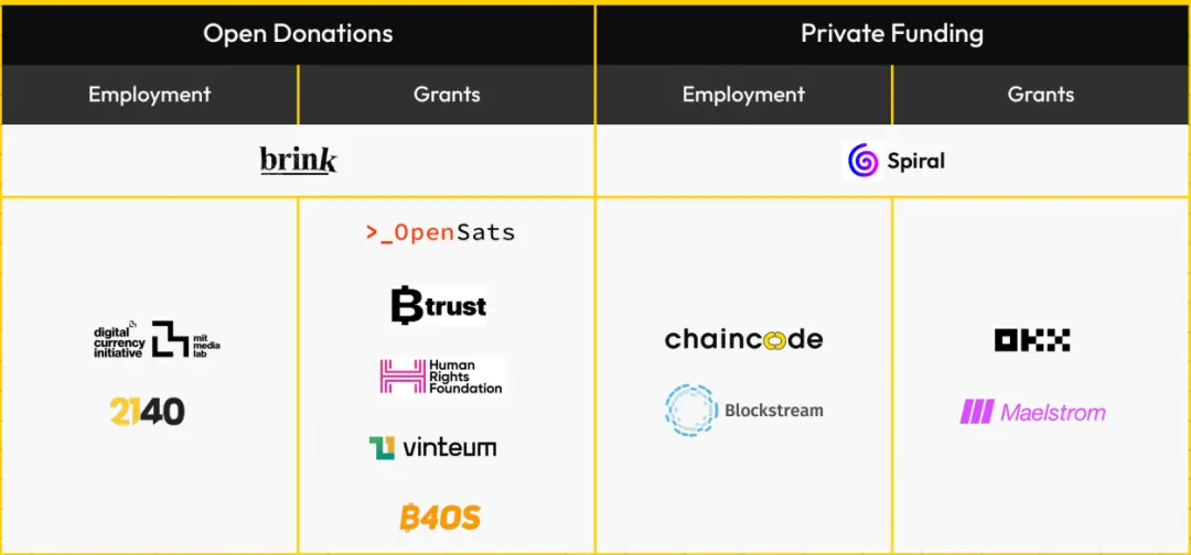 报告确定了 13 个主要赞助组织:Blockstream、Chaincode Labs、MIT、Spiral(前 Square Crypto)、OKX、人权基金会、Brink、Btrust、OpenSats、Vinteum、Maelstrom、B4OS 以及 2140。