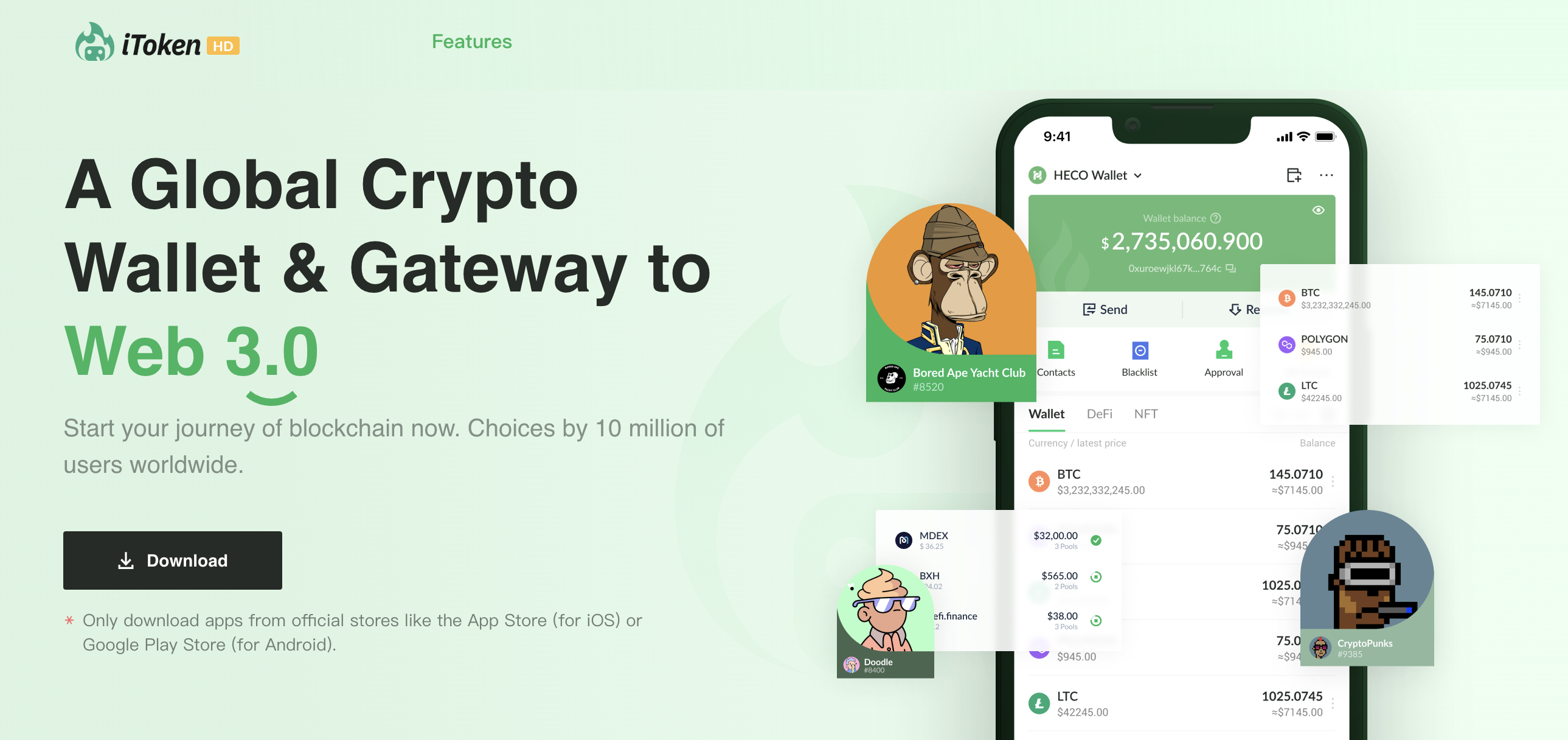 iToken支持来自许多热门区块链的100多万数字资产。其中包括以太坊、币安智能链、Solana、Avalanche和波场。iToken还为您提供了访问Web 3.0产品的机会,包括去中心化交易所和NFT市场。只需加载应用内浏览器,就可以私下交换、质押和管理加密货币。