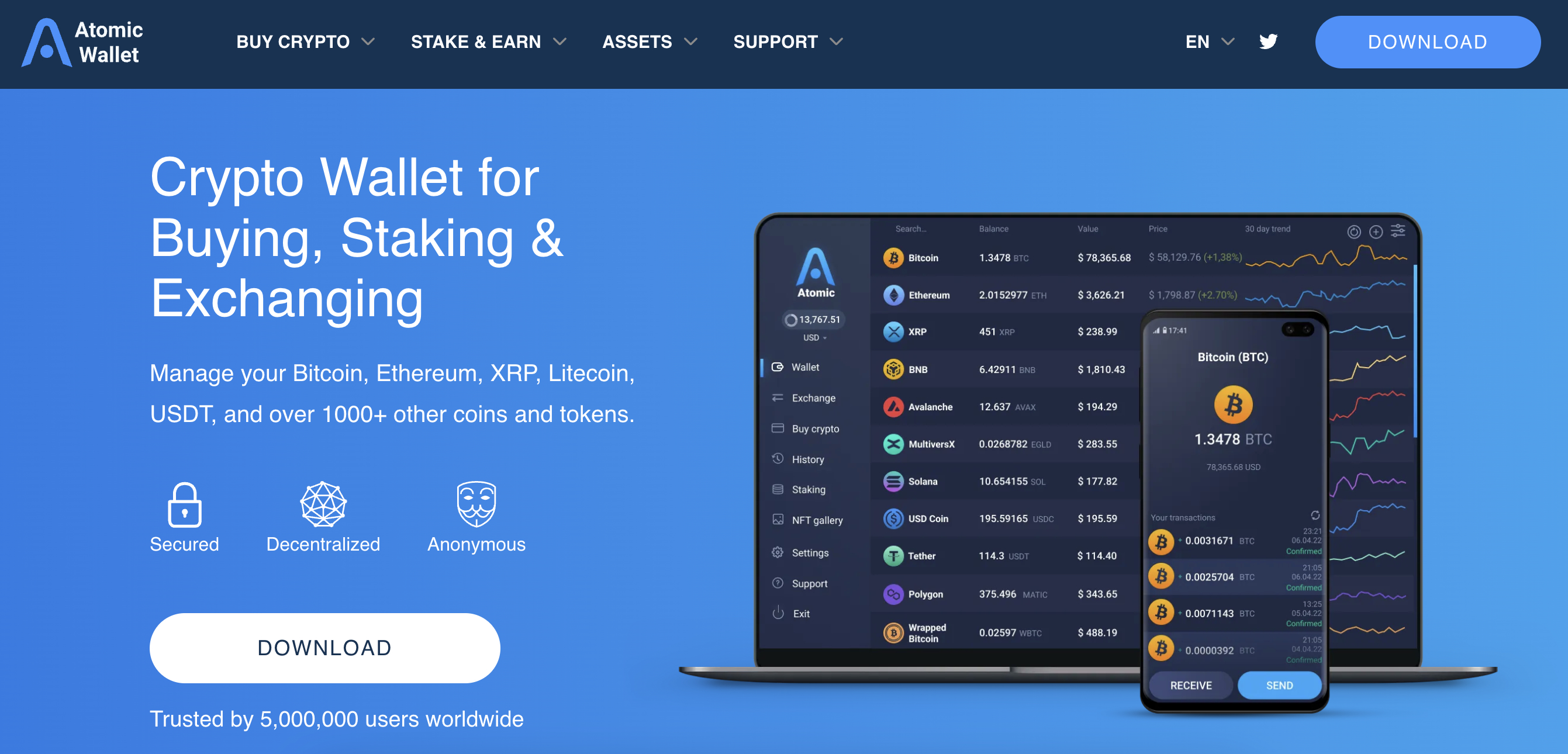 在质押加密货币时,无需透露身份,这使您可以保持匿名。Atomic Wallet是一个用户友好的钱包,提供自我托管存储。与许多匿名加密货币钱包一样,在开始时,您将获得一个独特的12个单词的备份短语。您的私钥经过加密并存储在设备上。
