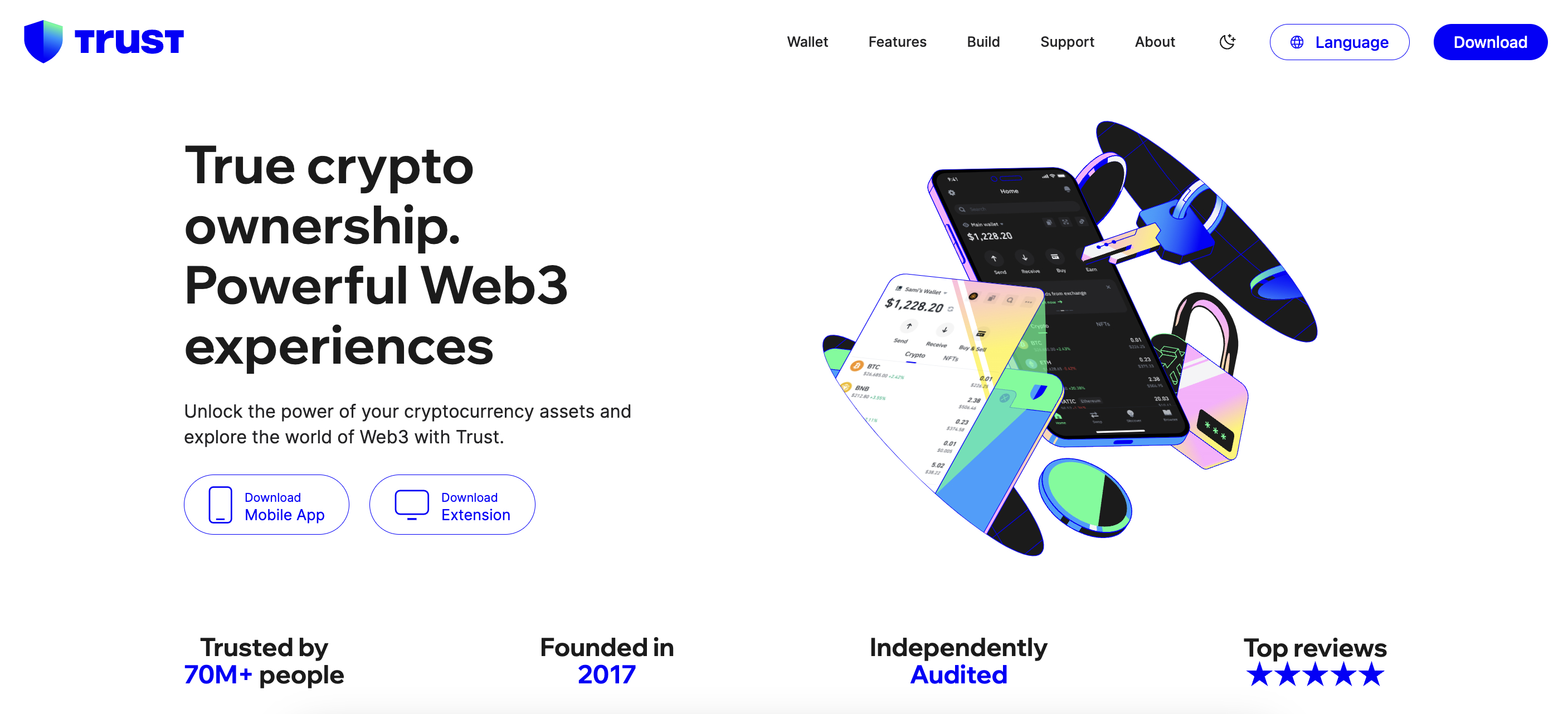 ● 顶级特点:支持100多万数字资产,实时市场分析,应用内浏览器提供了对Web 3.0生态系统的私密访问