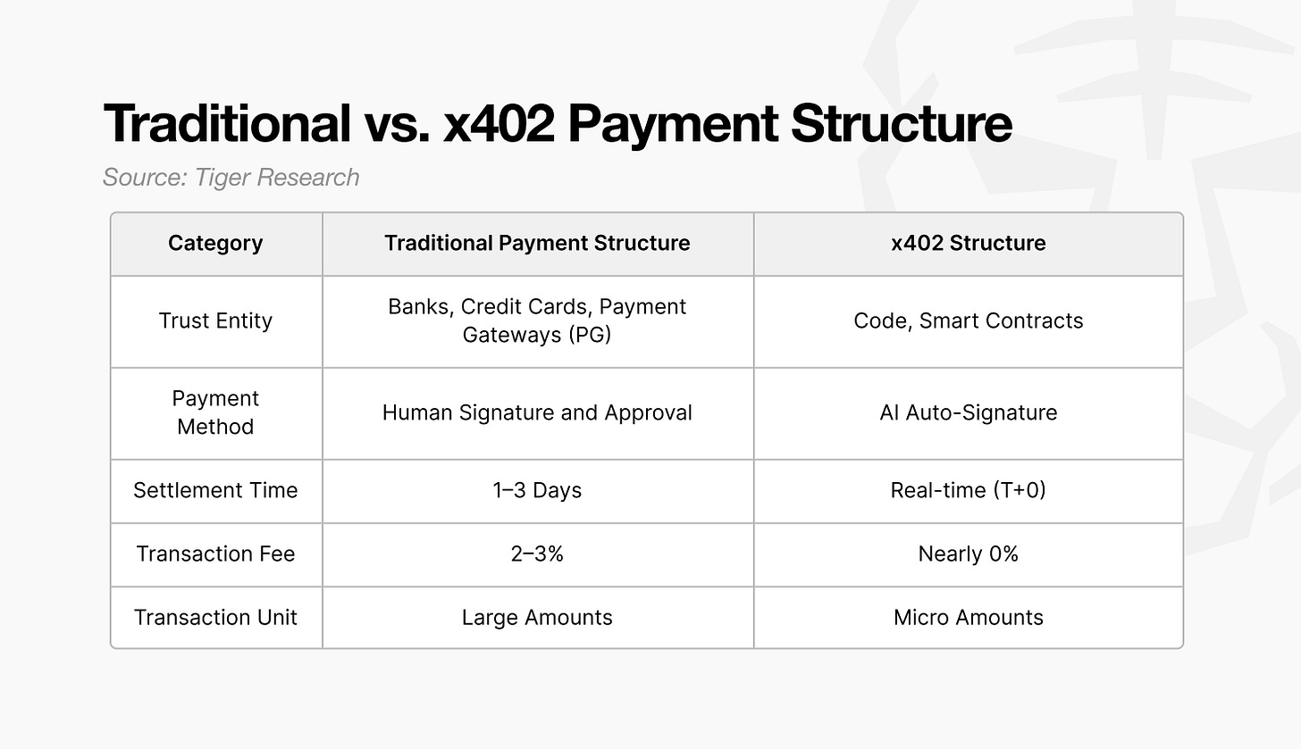 关键区别不仅在于速度,更在于信任和验证编码方式的结构性转变。在 x402 中,信任以代码形式表达:智能合约负责审批、结算和支付证明,而人工仅审核最终结果。交易有效性并非由金融中介机构保证,而是由协议规则和区块链记录保证,从而建立了一个去中心化、无中介的支付框架。