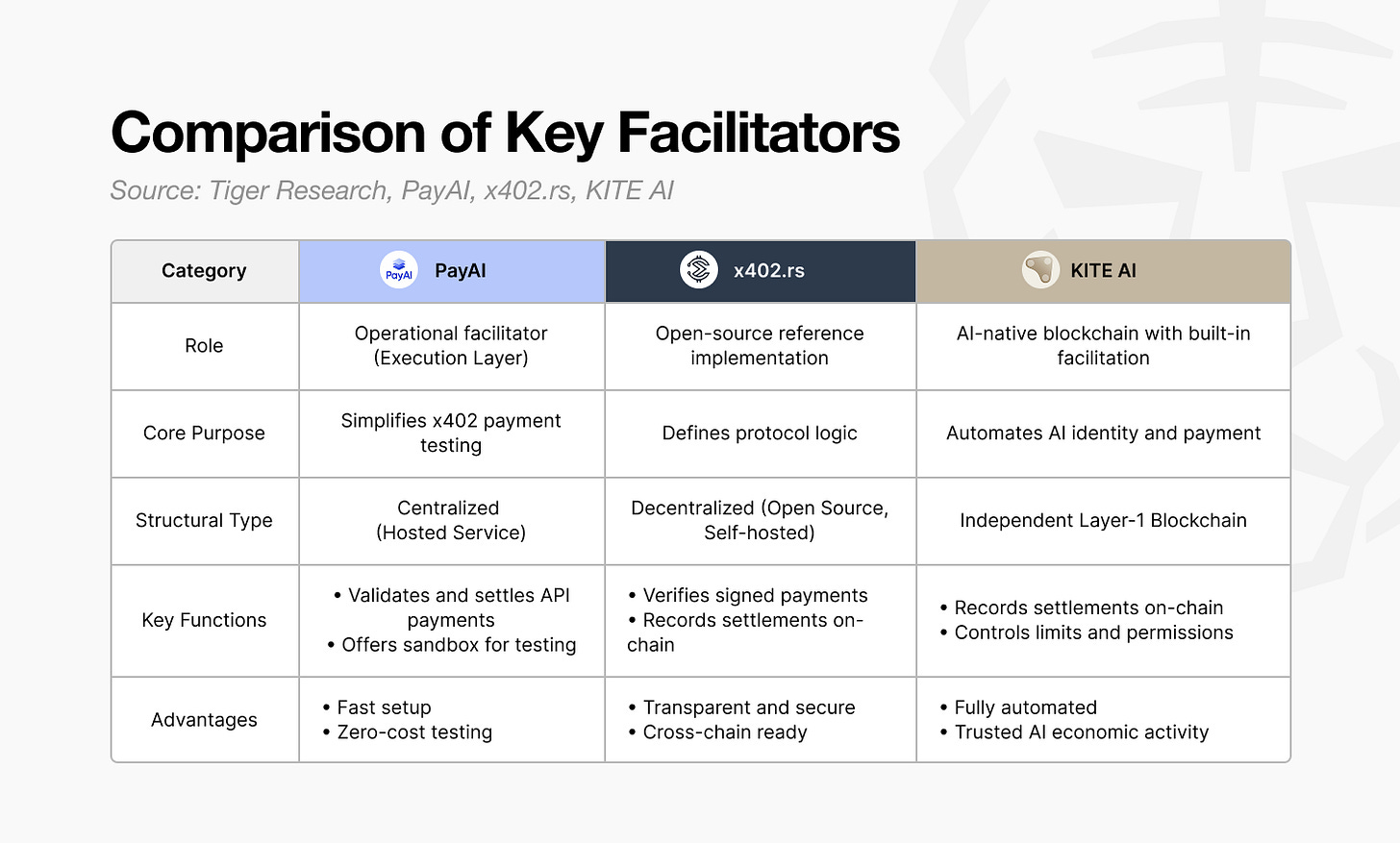 即使人工智能代理能够自主支付,也需要一个协调层来防止错误、重复支付或执行不一致的情况。这项功能由结算代理(Facilitators)负责——结算代理是中间节点,负责验证支付条件并管理人工智能代理和服务提供商之间的结算。在 x402 网络中,结算代理构成了信任和执行层,维护着交易的完整性。