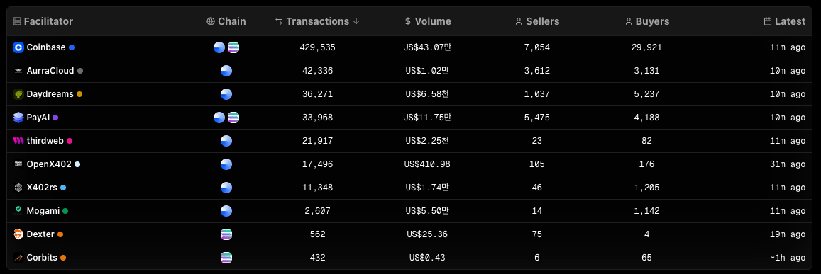 Source: x402scan 来源:x402scan 尽管 x402 生态系统中存在多家服务商,但 Coinbase 目前占据主导地位,市场份额约为 70%,PayAI Network 和 x402.rs 分别占约 10%的市场份额。另一家新兴参与者 KITE AI——由 Coinbase 投资——也开始引起市场关注。
