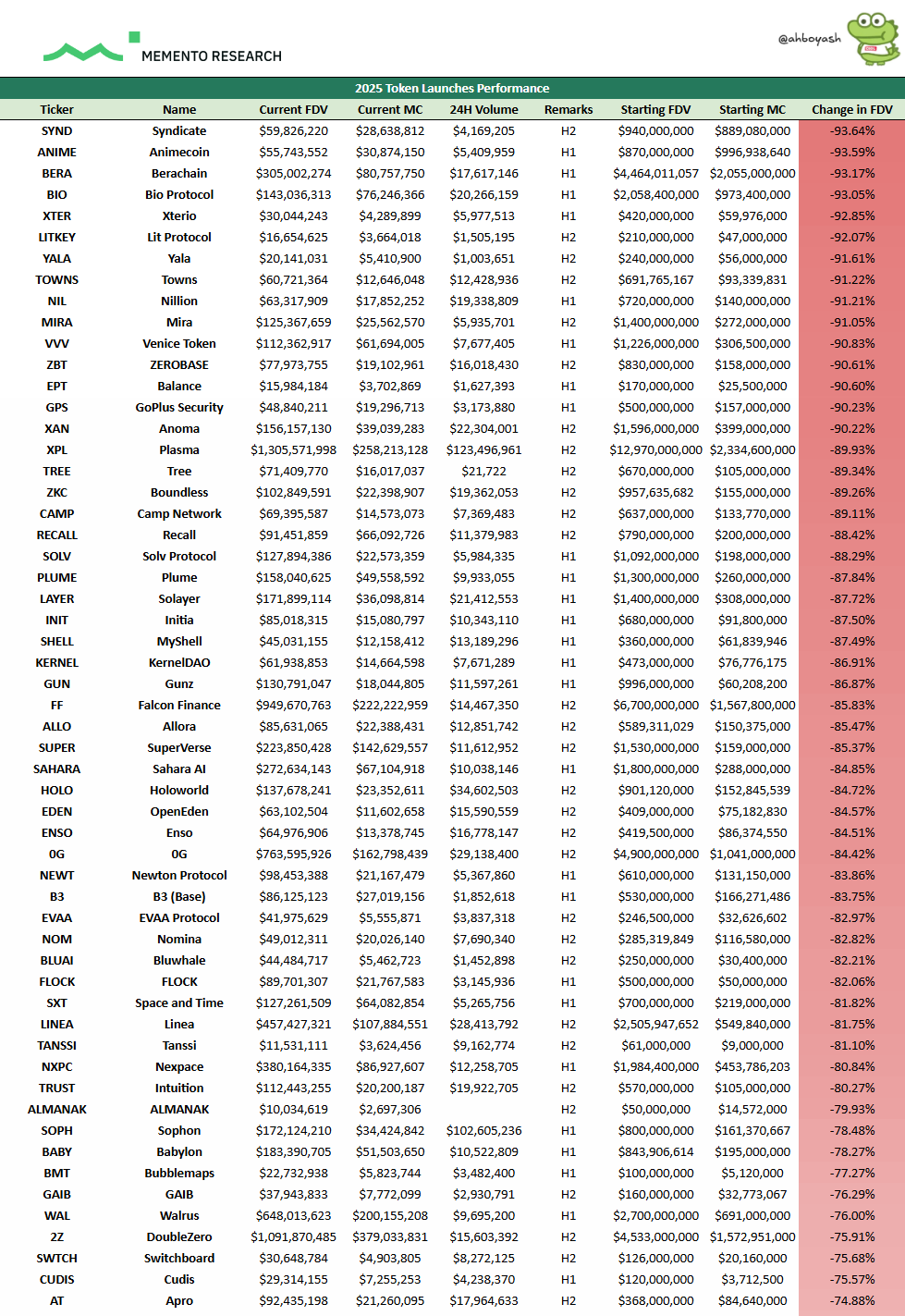 今年追踪了118次TGE发射,并将今天的FDV与开盘价进行了比较: