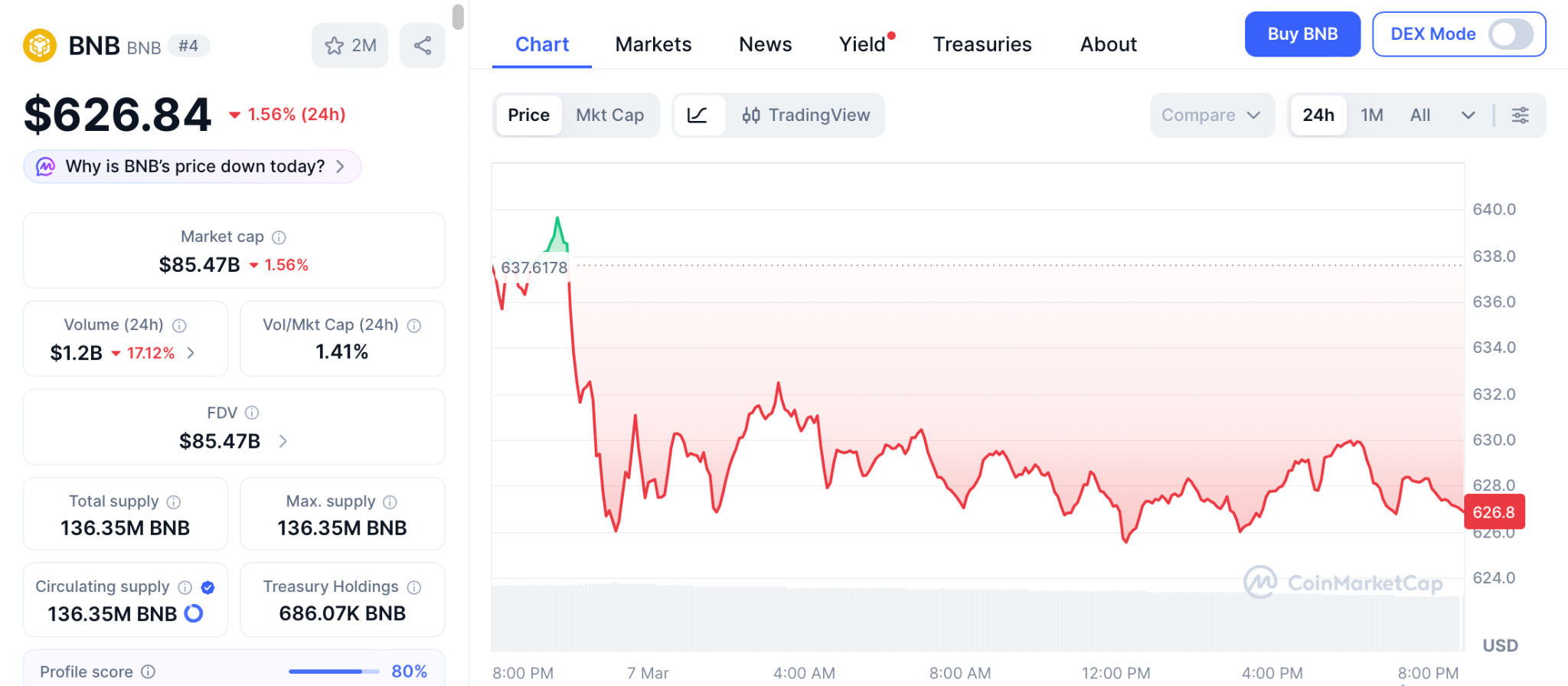 据CoinMarketCap数据,BNB暂稳于626美元附近,635美元阻力位持续承压。即便反弹至742美元,涨幅亦不足12%。