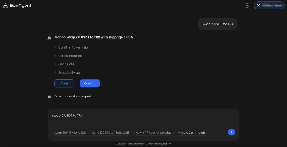 告别手动选择代币、反复确认参数的繁琐流程。用户只需通过输入自然语言指令,如“帮我把100 USDT换成TRX”,系统将计算最优路径并生成交易方案。用户确认该计划后,交易进入执行环节,这使复杂的操作简化为轻松的对话与决策。