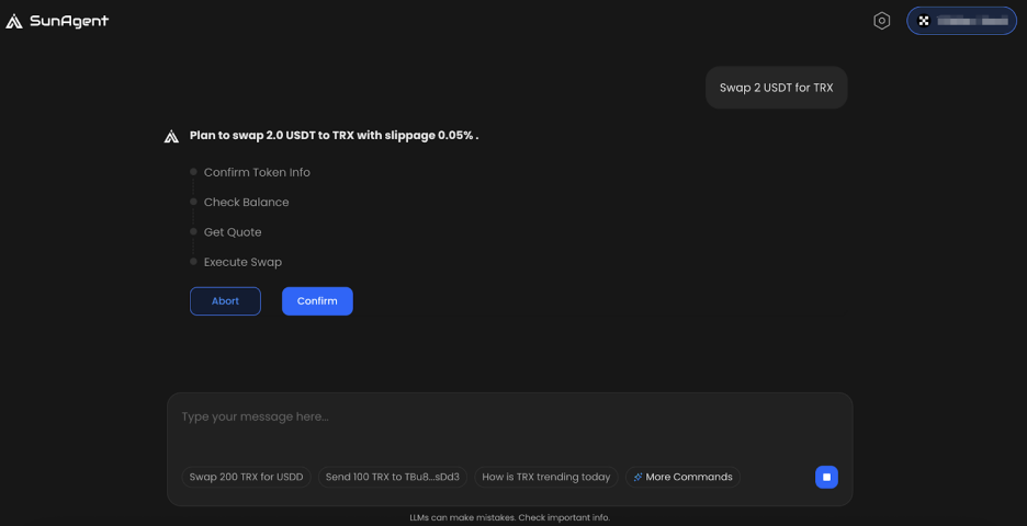 用户只需遵循以下几个简单的步骤,无需任何复杂的学习过程,即可立即驾驭SunAgent,体验用自然对话完成以往繁琐的链上操作,感受前所未有的便捷与高效。