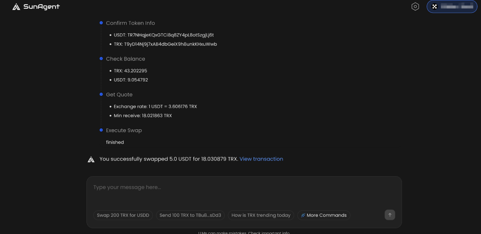 SunAgent的核心亮点在于其创新的“聊天式链上操作”体验。用户只需用一句自然语言表达需求,无论是转账、兑换、发行代币,还是质押资源、参与投票、数据查询,SunAgent都能精准理解并按照用户意图执行。它致力于将那些需要多步点击、反复填写参数、跨平台操作的复杂流程,全部整合到一个简单自然的对话界面中。用户只需说出自己的意图,剩下的工作便可交给这位聪明可靠的AI助手来完成。