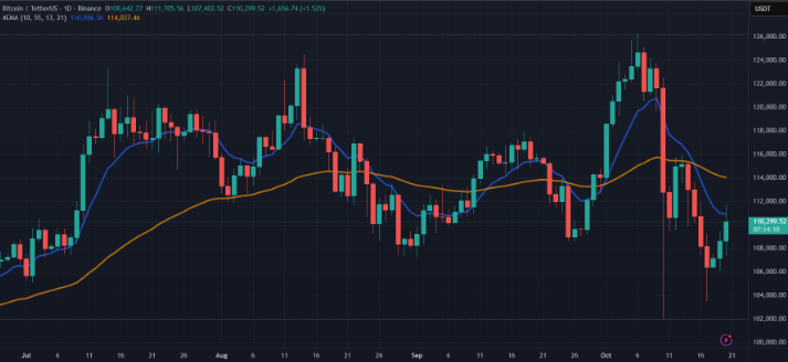 日线图显示,BTC 价格在上周跌至 10.3 万美元后,目前已突破 11 万美元。资料来源: TradingView.com 上的 BTCUSDT
