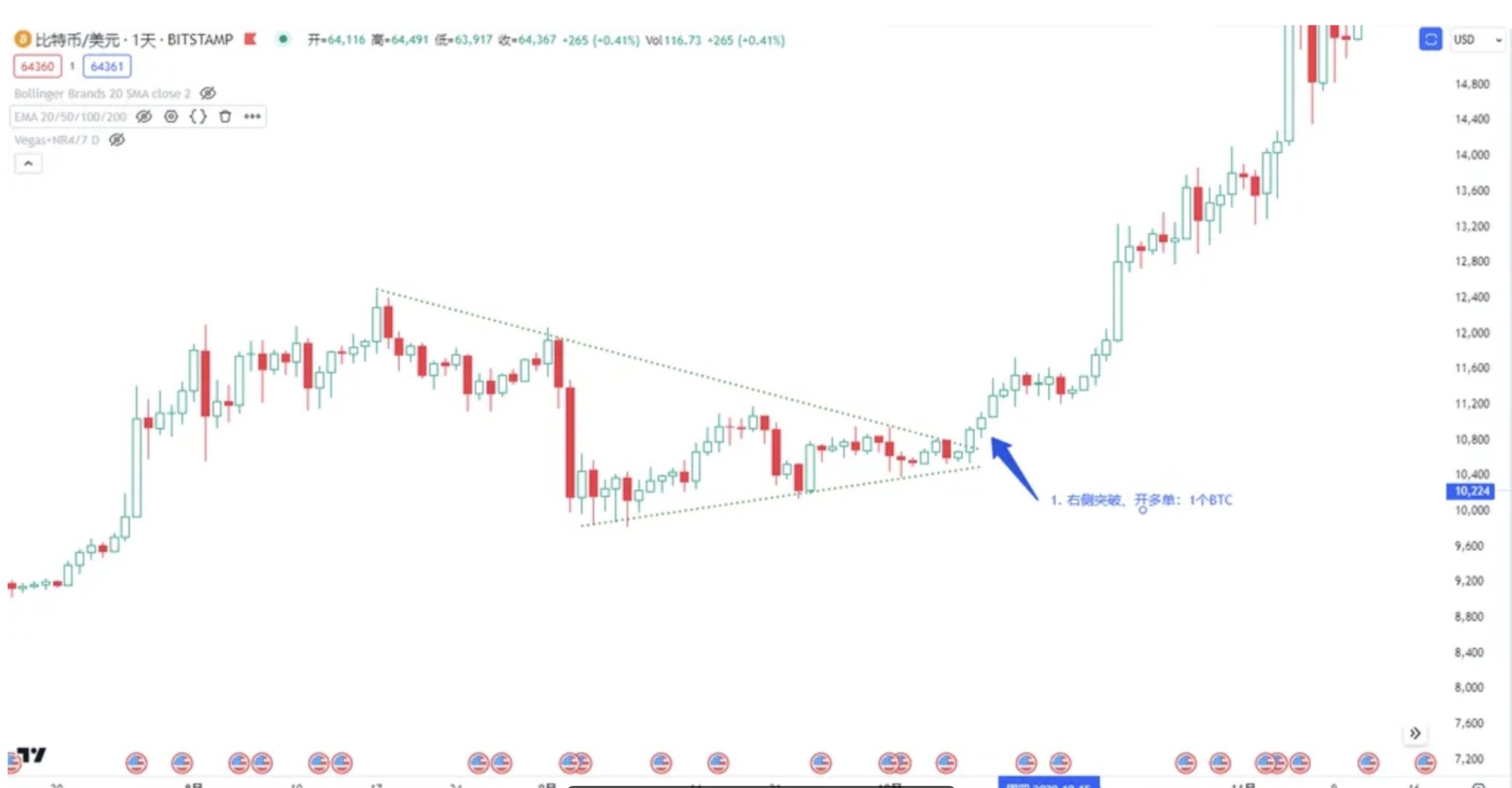 从 2020 年 10 月 到 2021 年 3 月,比特币从 1 万美元 飙升至 6 万美元。我们以这段行情为例,復盘滚仓操作如何助力资金快速增长。