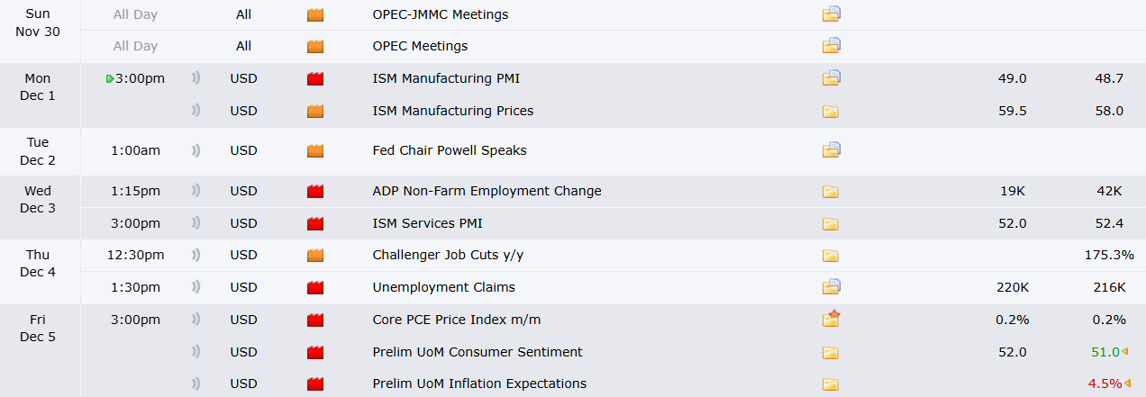 制造业数据将于周一公布,即11月ISM制造业指数。服务业报告将于周三公布。这两项调查都追踪商业活动和新订单。截至11月29日当周的首次申请失业救济人数数据将于周四公布。