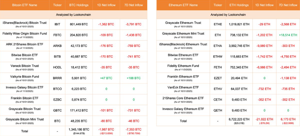 ● 与此同时,比特币现货ETF经历大规模资金外流。11月5日单日净流出达4.88亿美元,创近三个月新高。“ETF流出主要是短期交易者,而链上积累者是长期投资者,”Ki Young Ju补充道,“这体现了市场参与者之间的显著分化。”