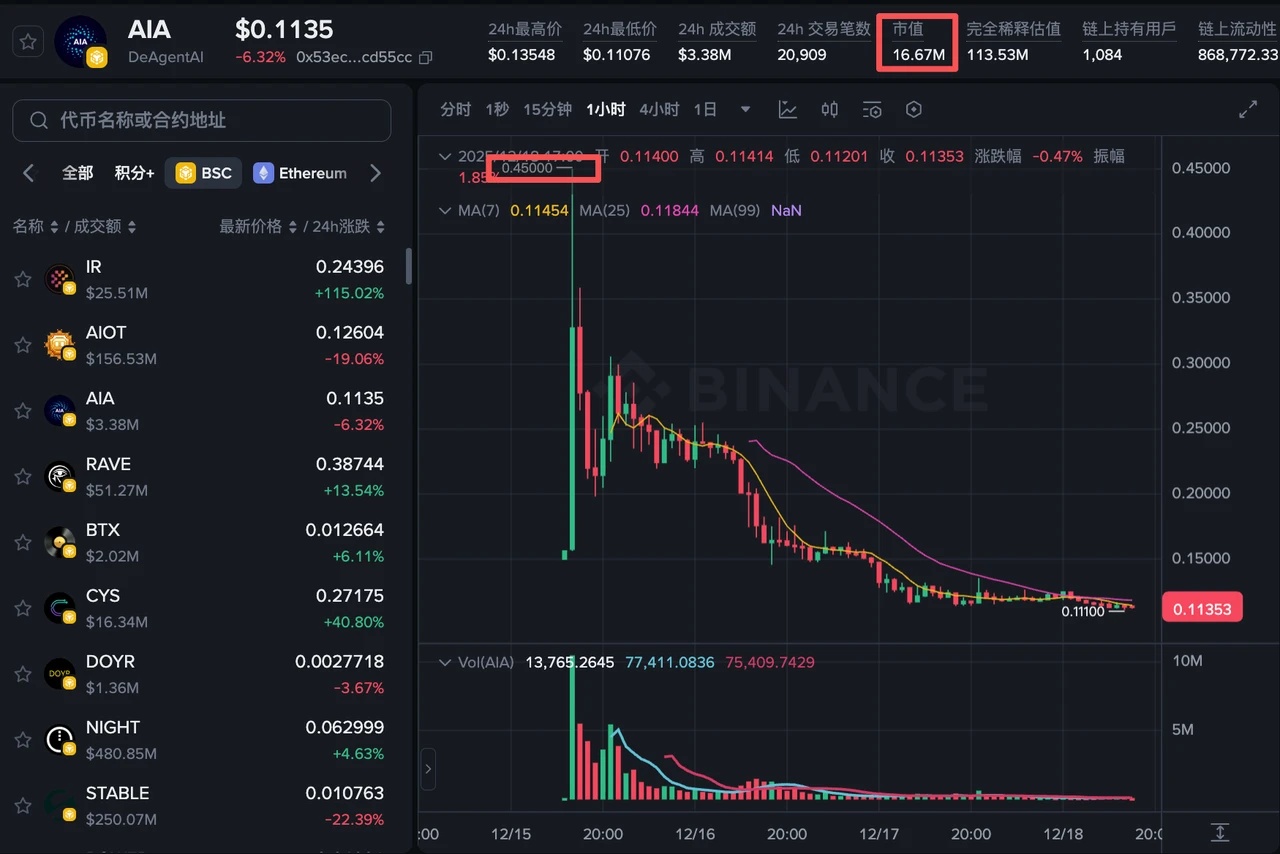 12月11日,据官方公告,币安期货宣布将于2025年12月11日20:15平仓所有AIAUSDT永续合约,并进行自动结算。结算完成后,该合约将下架,AIA一度暴跌超90%。