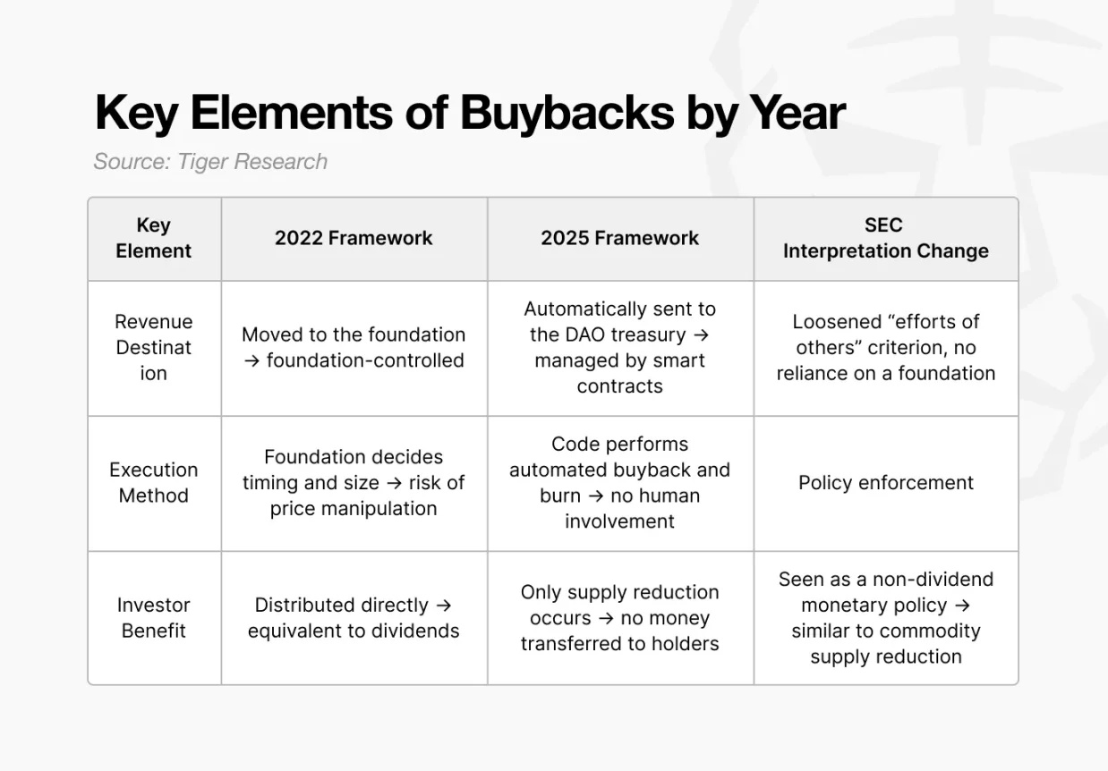 2025年,回购与自动销毁机制结合重现。在这种模式下,收入不直接分配给代币持有者,基金会对价格或供应没有控制权,销毁过程通过算法执行。因此,该结构进一步远离了监管机构先前标记的要素。