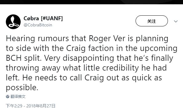 而此前称比特币耶稣Roger Ver站队CSW的消息,正是由Cobra推特传出。对此不少人认为Cobra此举只是想趁火打劫,甚至有挑拨冲突的嫌疑。