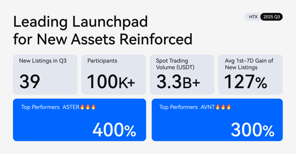 第三季度,HTX 新上线项目也取得突破性进展,共上线 39 个优质项目,包括 TREE 、 CAMP 、 WLFI 、 HOLO 、 LINEA 、 AVNT 、 ASTER 、 0G 、 XPL 、 FF 等首发项目,其中不少项目为早期参与者带来了丰厚回报,AVNT、ASTER、0G、XPL 的投资额均接近翻倍。其中, ASTER 凭借创新的“零 MEV、低滑点”模式,上线后交易量飙升 400%,成为本季度表现最佳的项目;Base 生态优秀项目 AVNT 更是实现了三倍增长;特朗普家族支持的 DeFi 项目 WLFI 也引起了市场的广泛关注。HTX 持续涌入的优质资产进一步巩固了其作为新机遇启动平台和早期代币上线首选地的地位。