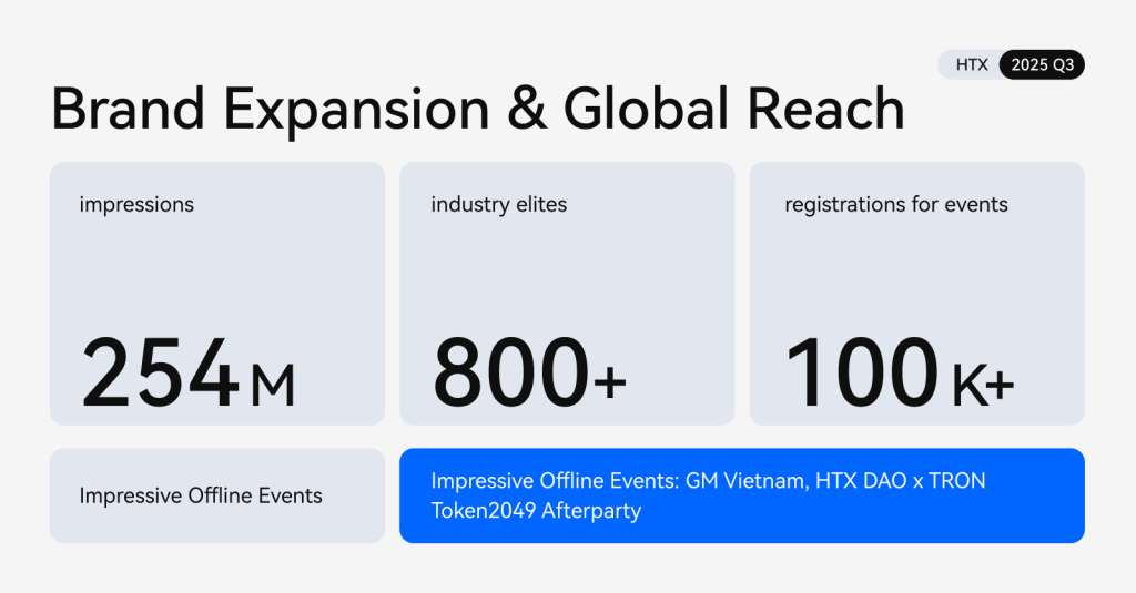在品牌曝光方面,HTX 持续拓展线上线下覆盖范围。在越南通用汽车大会上,超过 1,300 名用户现场注册,为本季度奠定了强劲基调。在 TOKEN2049 新加坡站及余兴派对期间,HTX DAO 和 HTX Ventures 的品牌曝光量总计达 2.54 亿次,覆盖超过 3,100 名客户和 800 名行业专业人士,其中 12 周年纪念版“火焰”元素令人印象深刻。同时,孙宇晨出席余兴派对,并为 HTX 小姐总决赛的前三名选手颁奖。