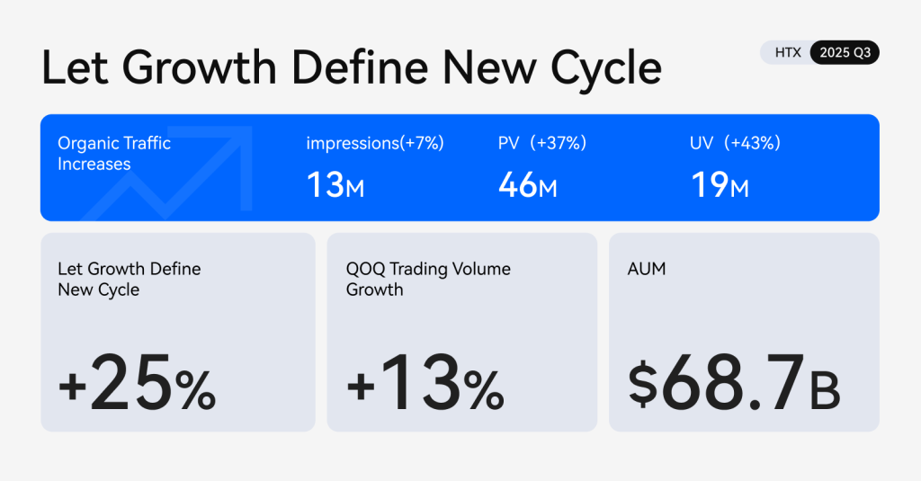 2025 年第三季度,HTX 总交易量环比增长 25%,新注册用户增长 13%,平台用户规模再创新高。HTX 用户总资产达 68.7 亿美元,环比增长 6.4%,进一步巩固了平台全球领先交易所的地位。