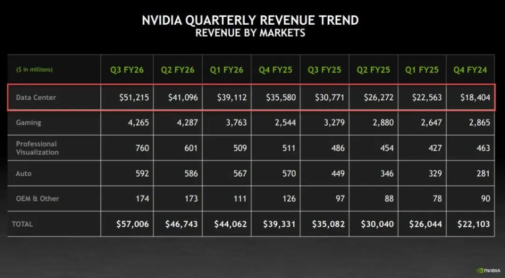 ● 数据中心业务成为最大亮点,贡献了将近九成营收,单季收入512亿美元,同比激增66%,环比大增24.6%。这一表现明显超越了分析师预期的493.4亿美元,显示出全球AI基础设施建设的迫切需求。