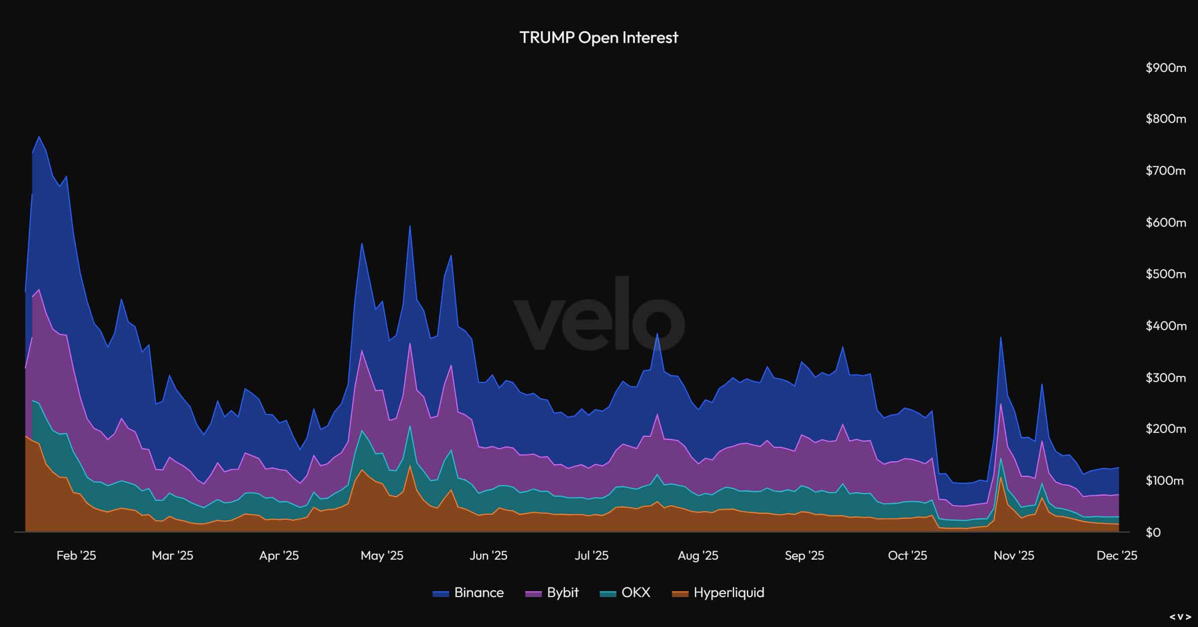 根据Velo的数据,未平仓合约(OI)总值从2025年初的5.5亿美元以上缩减至12月份的1.2亿美元。
