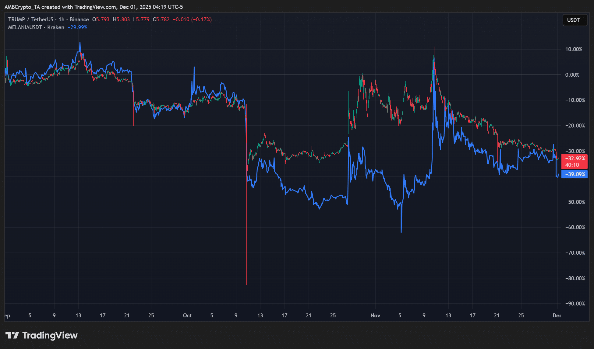 对2025年第四季度的乐观预期最终变成了一场惨败,而模因币是最大的受害者之一。特别是像Official Trump[TRUMP]和Melania[MELANIA]这样的代币,其2025年的跌幅已经扩大。