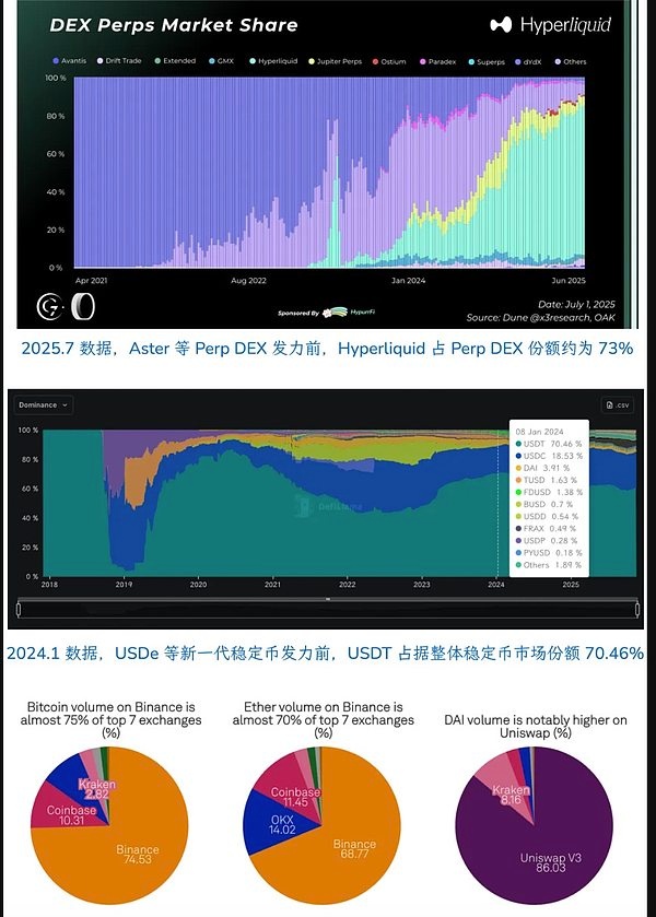 经验性的总结,在稳固的市场结构下,最头部项目可占据该赛道的70%市场份额,但是市场环境因时而变,目前Hyperliquid、USDT和币安的份额都已经降到50%以下。
