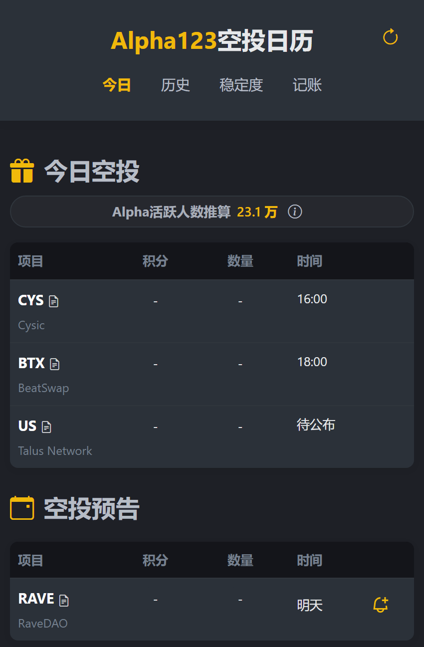 刷分参考ARTX,久违的双吃回来了,明天也提前安排了空投,看今天能不能恢复正常价值50-100U,如果来个大的,Alpha应该又能起来,要不然就30U慢慢玩到过年,留下真实用户,不是纯粹薅羊毛的才能活下来。连夜离职5万人,没有赚钱效应,用户会用脚投票。