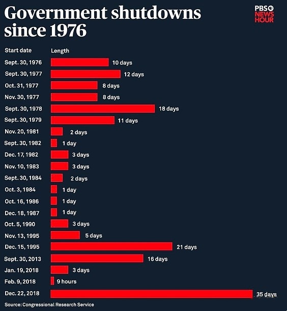 时隔六年,10月1日,美国政府再次关门大吉。当时,特朗普表示,政府关门可能会带来“很多好处”,并威胁称,如果国会不能在午夜的拨款最后期限前满足要求,他将罢免联邦工作人员并取消民主党人青睐的项目。 特朗普还曾告诉记者:我们可以摆脱很多我们不想要的东西,而那些东西都是民主党的东西,他们就是学不乖。所以我们别无选择。我必须为了这个国家这样做。
