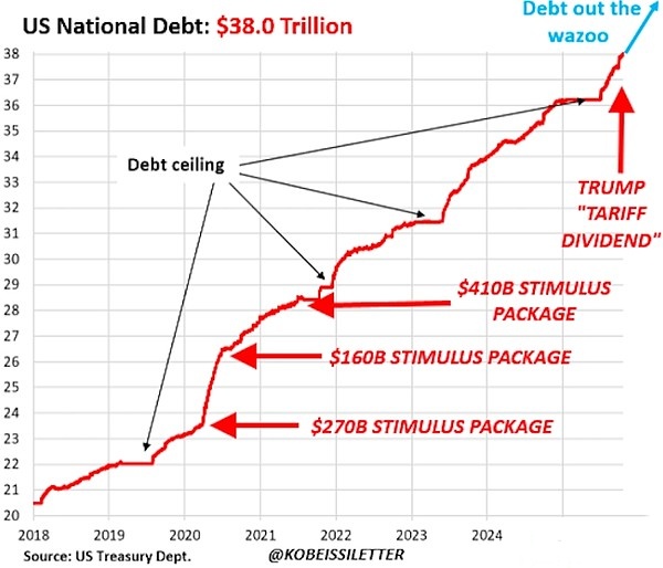 Kobeissi Letter 针对“特朗普人均 2000 美元关税红利”发表详细市场分析称,特朗普总统刚刚宣布了关税红利,每位美国人至少可获得 2000 美元,预计超过 85% 的美国成年人将获得这笔款项,发放总额将超过 4000 亿美元。与此同时美国债务已逼近 40 万亿美元,这种大规模刺激式支付的经济影响是巨大的。