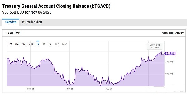 据美国财政部一般账户期末余额(I:TGACB)显示,目前,余额为9535.5亿美元,与此前的长期处于7500亿美元以下形成鲜明对比,政府开门之后,必定会大量花钱,或将为金融市场注入两千亿美元的流动性。