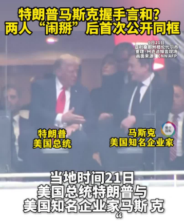 当地时间21日,美国总统特朗普的政治盟友、保守派“网红”查理·柯克的追悼会在美国亚利桑那州格伦代尔市举行,特朗普和美国知名企业家埃隆·马斯克都现身追悼会现场。据美国媒体报道,这是特朗普与马斯克“闹掰”后首次公开同框,两人相邻而坐并握手交谈。