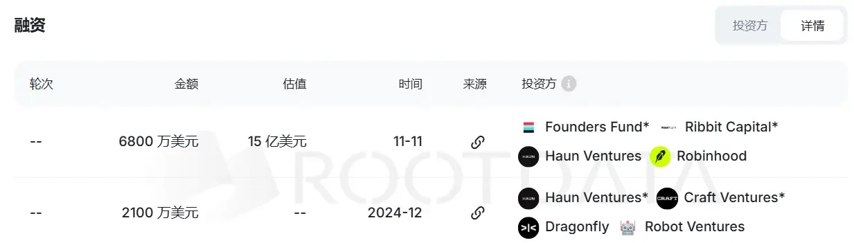 根据RootData数据,Lighter于今年11月完成了由Founders Fund和Ribbit Capital领投、Robinhood参投的6800万美元巨额融资,其Pre-TGE估值已高达15亿美元,在此之前更有Dragonfly、Haun Ventures等老牌机构为其背书。