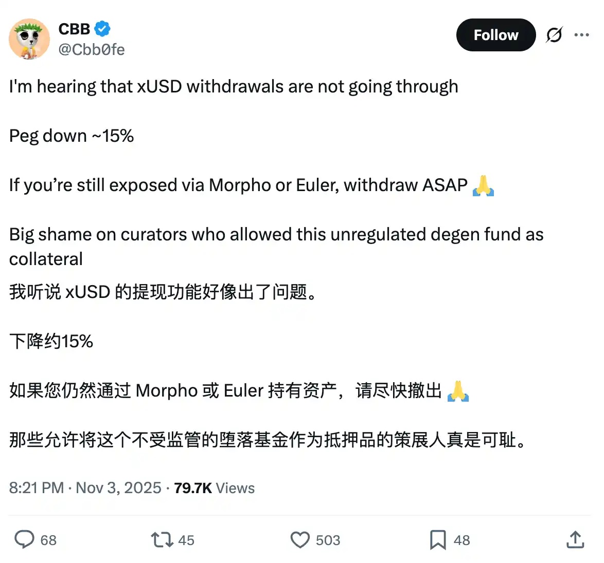 当xUSD的市场价格跌破其账面价值时,相关头寸并未立即被清算,其原因在于许多市场并未将抵押品的价值与现货AMM(自动化做市商)价格挂钩,而是依赖硬编码或「基础价值」喂价,这些喂价追踪的是报告的资产支持而非当前的二级市场价格。