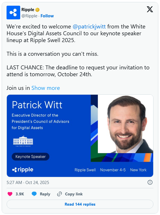 Witt入选演讲嘉宾阵容,引发了XRP支持者的积极反应。一些社区成员将此解读为机构和政府对Ripple技术及其在塑造数字金融未来方面所扮演角色的认可。
