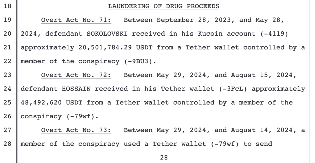 第71项公开行为:2023年9月28日至2024年5月28日期间,被告人索科洛夫斯基在其库币(Kucoin)账户(-4119)中,收到来自该犯罪团伙某成员控制的泰达币钱包(-9BU3)转入的约20,501,784.29 USDT。