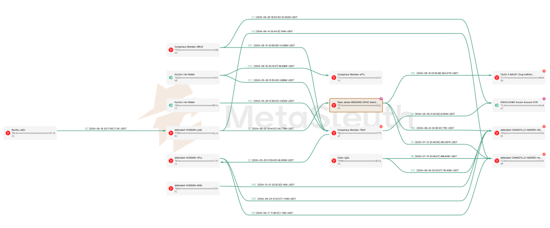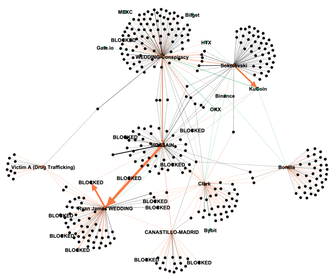 从资金流关系图可以观察到,HOSSAIN与SOKOLOVSKI构成了两个显著的资金汇集中心,而标记为“WEDDING Conspiracy”的地址集群则是这两个中心的主要资金来源。