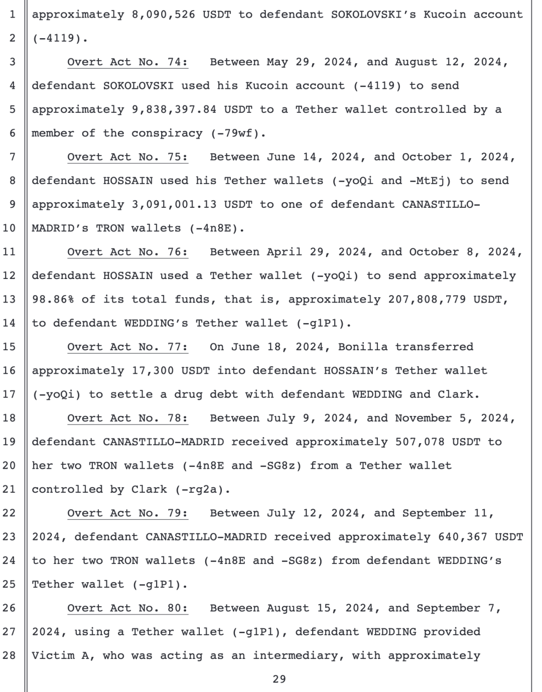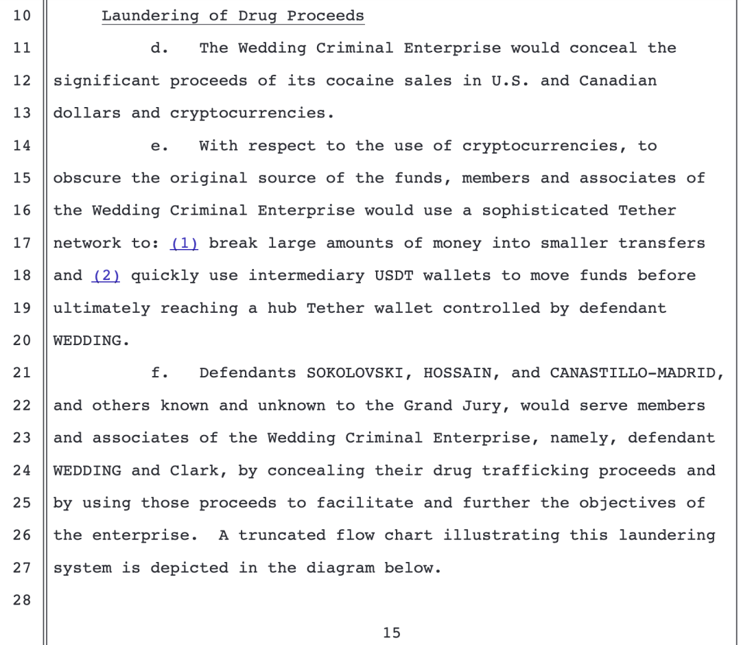 根据起诉书,Wedding犯罪集团主要以美元、加元以及加密货币形式对贩毒所得进行清洗。其中,对于加密货币资产,犯罪集团将大额资金拆分成多笔小额转账,通过中间的USDT钱包快速完成转移,并最终将资金汇入被告WEDDING控制的中心Tether钱包。