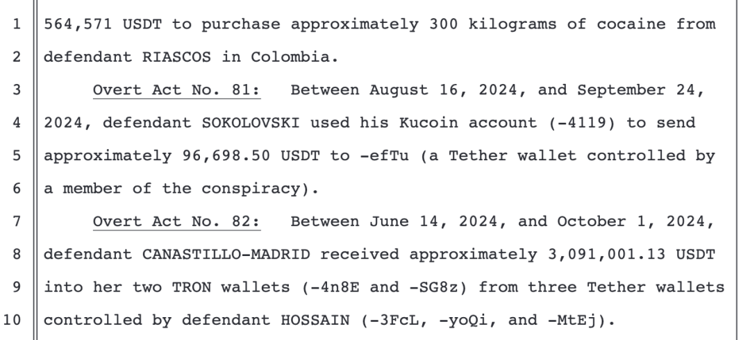 第80项公开行为:2024年8月15日至2024年9月7日期间,被告人韦丁通过一个泰达币钱包(-g1P1),向担任中间人的受害者A提供了约564,571 USDT,用于从哥伦比亚的被告人里亚斯科斯处购买约300公斤可卡因。