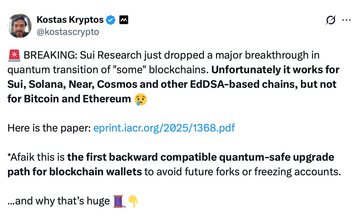 7月,SUI Research发布了一种新的加密框架,旨在保护区块链免受量子计算威胁——无需硬分叉、新地址或密钥重置。
