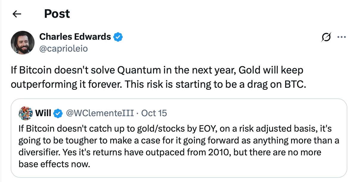 10月15日,他在X上发帖称:“如果比特币在未来一年内无法解决量子力学问题,黄金将永远跑赢比特币。”
