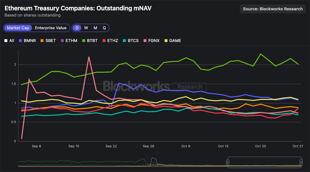 DATCO 方面,情况并不乐观。ETHZilla(纳斯达克股票代码:ETHZ) 宣布出售了约 4000 万美元的 ETH 库存,并计划将所得款项用于回购股票。自 10 月 24 日(周五)以来,ETHZ 已回购约 60 万股,耗资约 1200 万美元,并计划继续回购股票,直至其净资产值折价恢复正常。值得注意的是,尽管 ETHZ 在 9 月 26 日曾表示拥有 5.69 亿美元的现金,但该公司却无法动用现有现金回购股票。如下所示,10 月 22 日 ETHZ 的市值净资产值(mNAV)为 0.6 倍,在所有同类公司中最低。昨天的公告发布后,ETHZ 的市净率收于 0.86 倍,这表明该公司将根据其 2.5 亿美元的回购授权回购更多股票。
