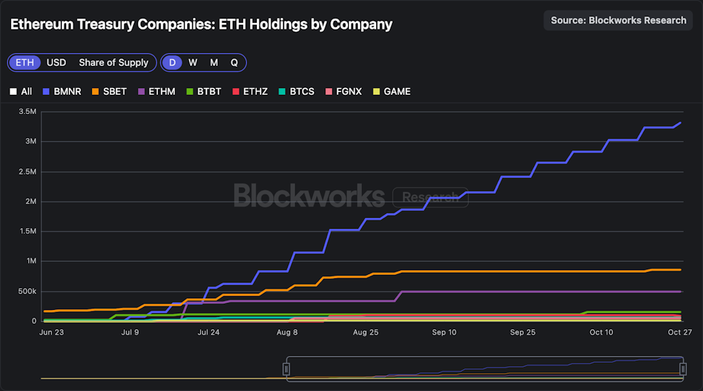 DATCO 的“魔力”在于它们能够通过出售股权来购买更多底层代币,从而持续运转,而这依赖于 mNAV 溢价。问题在于,这本质上是一种营销策略,像 ETHZ 这样以低于 NAV 的价格交易的 DATCO 已经收紧了融资条件。在以太坊 DATCO 中,BitMine (BMNR) 的交易价格仍然略高于 mNAV(1.08 倍),尽管这一比率在最近几周有所下降。BMNR 昨日宣布 ,继上周的收购之后,其持有的 ETH 已超过 330 万枚,价值约 137 亿美元。BMNR 目前持有的 ETH 数量几乎是其最接近的竞争对手 SBET 的四倍。
