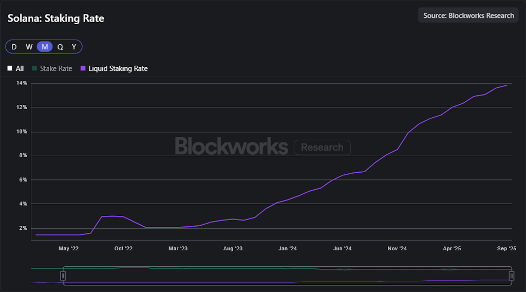 Solana 质押 ETF 即将面世。VanEck 已提交 S-1 文件 , 拟推出 JitoSOL ETF,该 ETF 将直接持有 Jito 的流动性质押代币。随着更多基金的推出和规模扩大,LST 的渗透率潜力将进一步提升,传统金融资金流入与 Jito 价值循环之间的联系也将更加紧密。值得注意的是,Solana 上的流动性质押一直在稳步增长,目前已接近总质押量的 15%。