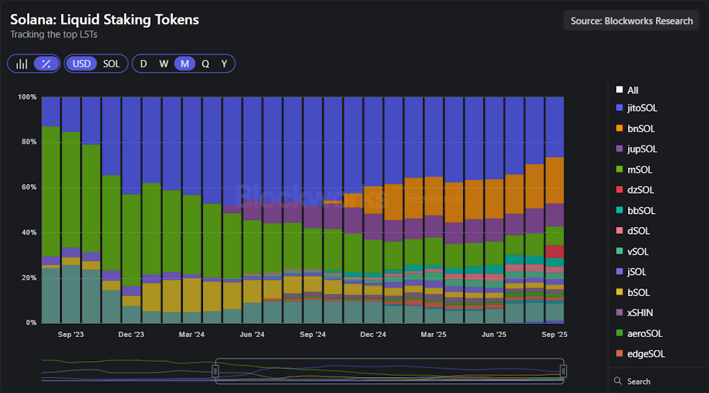 然而,Solana 的流动性质押市场竞争日趋激烈。JitoSOL 曾一度占据近一半的质押流动性,但随着新进入者的涌入,其份额已降至 25% 左右。尤其是 Sanctum,凭借其品牌化的 LST 模型和合作伙伴关系,发展势头迅猛,使协议能够推出定制化的质押产品,直接与 Jito 的产品展开竞争。