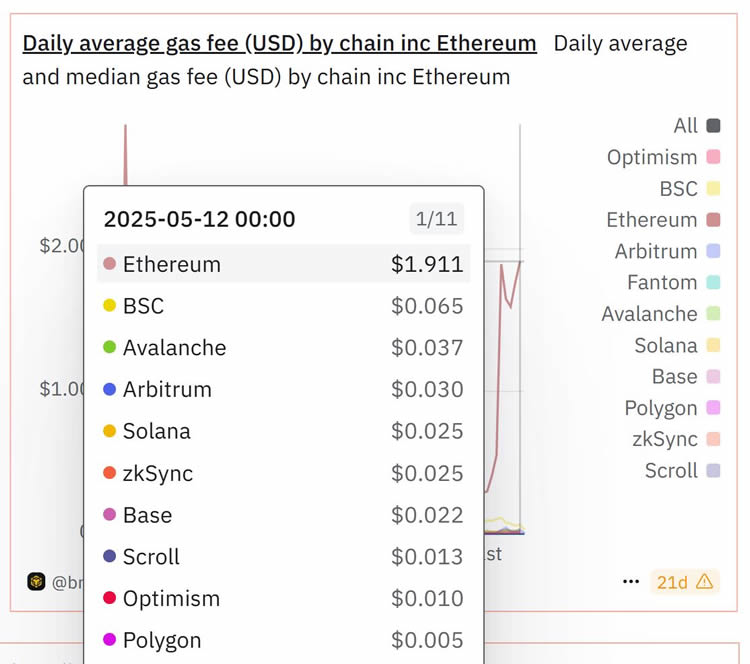 可参考Major Chains Gas Fee Comparison Dashboard中数据。