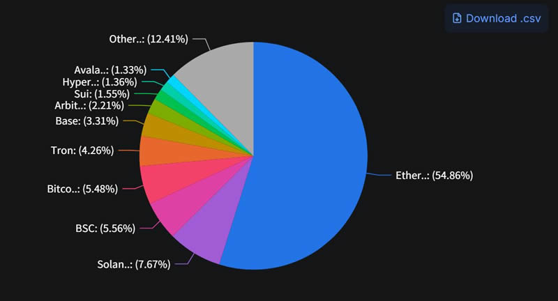 TVL = Total Value Lock,锁定在该链上的加密资产总额,能呈现正在该链上参与协议的资产规模,是评估DeFi 生态的直接指标之一。