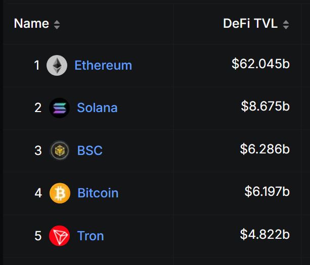 4、Bitcoin - 随着技术发展,Bitcoin 现在也能执行简单的合约指令,这两年来TVL 飙升数十倍