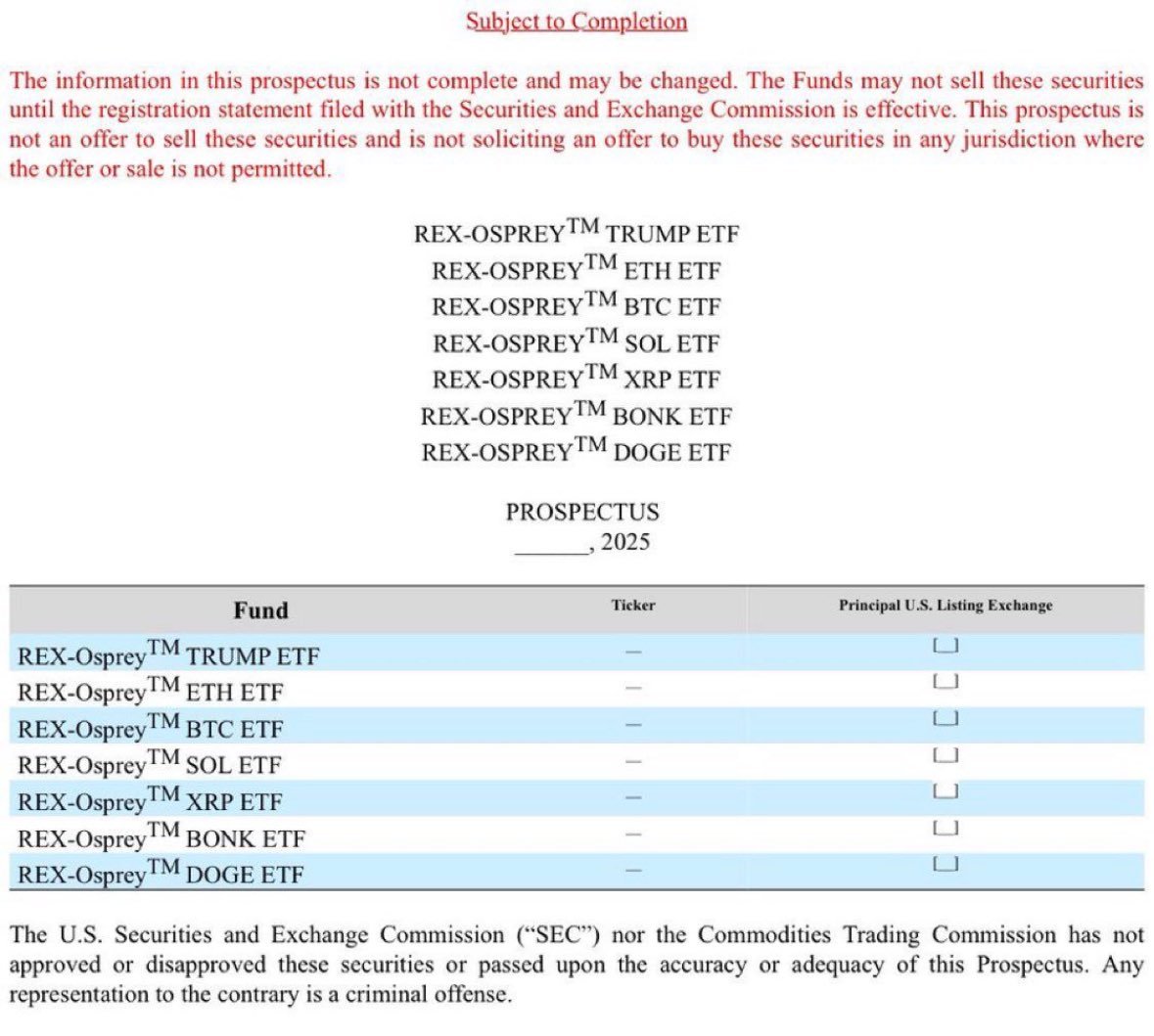 Dominus的帖子中提到的招股说明书列出了REX-Osprey的几款产品,并明确提到了XRP基金。提交给美国证券交易委员会(SEC)的相应文件包括485表格和生效的招股说明书,其中定义了该ETF的结构、目标和附属安排。